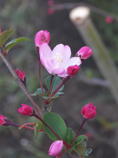 今日の写真は 1週間ほど前から桜と前後して咲き始めたハナカイドウ。バラ科リンゴ属というから形はやはりリンゴの花に似ているような気がする。この写真は咲き始めのころで花が上向きだが、花盛りになると重くなるのか下向きに垂れるみたいだ。 | |