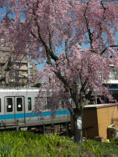 今日の写真は、満開になった枝垂れ桜。どこにでもある風景ながら、後ろを小田急線列車が走りぬけていく。 明日以降の写真掲載になると思うが、今日気付いた開花の花は、ライラック、カラスノエンドウ、シロハナマンサク、etc. | |