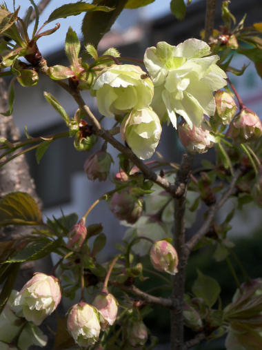 白に若干緑がかった花の色の八重咲き。鬱金(ウコン)という桜の種類らしい。珍しい桜だと思う。 | |