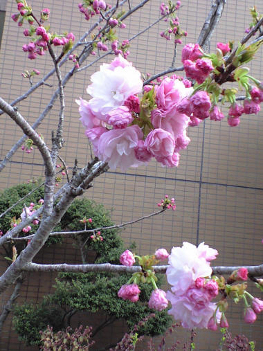 昨日に続けて変わった桜の花。これもソメイヨシノが散りかかってから咲いた、遅咲きの変わり種。八重の花姿が大きめでとても艶やかだと思ったら、名前もその通り。楊貴妃というらしい。 | |