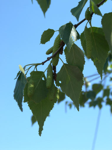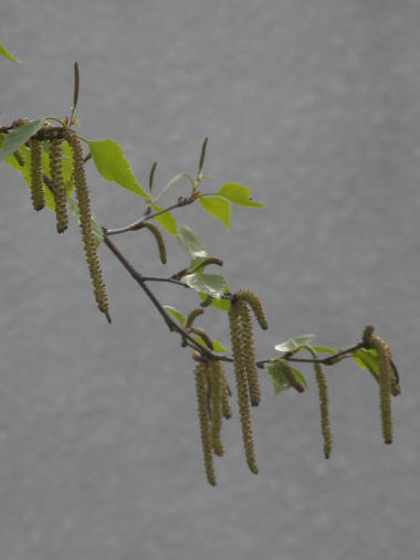 白樺に何か虫のようなものがぶら下がっていると思って良く見たら、どうやら花のようだった。花穂(かすい)というのか、ネコヤナギのような花がもっと細長くなった房のような花らしい。斑で余り拡大するとちょっと気持ち悪い模様なので、このくらいで丁度いいかと。 | |