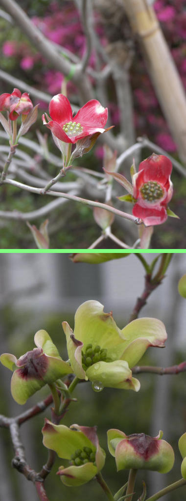 今日の写真はハナミズキの開花。開花直後でまだ一目して「ハナミズキ」と分かるヒラヒラした形にはなっていない。下の写真のように近くにある別の緑色した花(記憶ではこの木の開いた花弁 [総包というらしい] は白だったような気がするが)も同時に咲き始めた。 | |