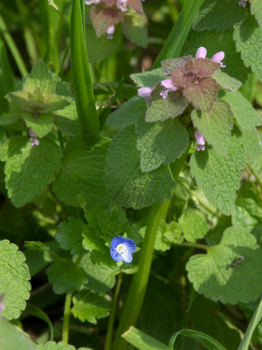 写真はオオイヌノフグリとヒメオドリコソウ。何時も散歩する桜並木が整備されて、雑草は芽を出す端から目の敵のごとく抜かれてしまって殆ど見ることができない。代わりに近所の公園はそれほど手入れされないので、周辺にはこうした雑草がはびこって良く見ると楽しい。艶やかな栽培種の樹木もいいが、毎食ご馳走ばかりの食事だと却って飽きてしまうのと同じで、たまにはこうした雑草や野草があるとほっとする気がする。それにしても「オオイヌノフグリ」何とセンスのない名付けなんだろう! | |