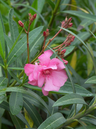 朝から梅雨本番のような天気で、雨の合間を縫って散歩したが、カメラを持っていかなかった。早くも夾竹桃の花が咲き始めていたので、携帯カメラで撮影してきた。よく見るとそれなりの画質だがとりあえずアップしておく。(その後差し替え済み) | |