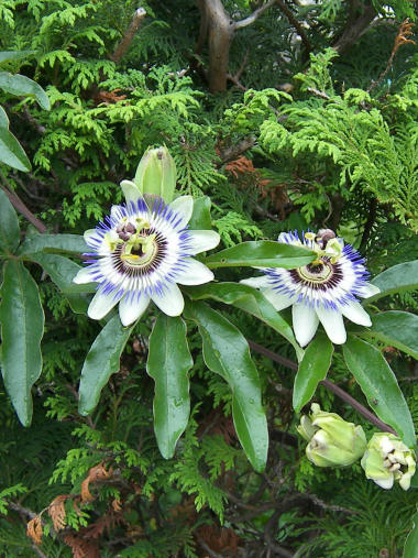 5月中旬ころから散歩途中の家の東向きの垣根のトケイソウが咲き始めた。そのトケイソウの写真は去年掲載した記憶があるが、最近になって 別の家の西向きの生け垣にトケイソウの蔓が延びて、花が咲き始めたのを見つけた。こちらは随分と艶やかで「時計」に似たそのものズバリの花の形だ。もしかして?と思って花弁の数を数えたら12枚じゃなく 10枚だった。残念! | |