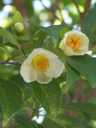 <今年も>夏ツバキが咲いた。高いところに咲くので落花が地面に散り敷いて気付いた時には盛りを過ぎていたようだ。 | |