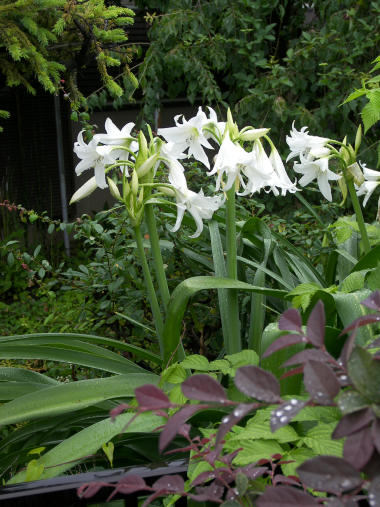 写真はハマユウだと思う。散歩道の脇の民家の庭に 1月ほど前から咲き始め、もうそろそろ姥になりつつあるが筒状花の白が梅雨の曇天の光の中でもまぶしい。でも、同じ白い筒状花でも日本人には白ユリの方が人気が高いと思う。ハマユウよりも花の数が少なく、楚々とした感じを好むんだろうか? | |