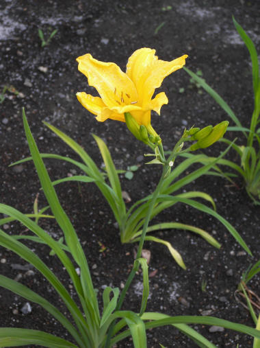 写真は多分カンゾウの仲間だろうと思う。カンゾウとニッコウキスゲなどキスゲの花の違いは良く分からないが、カンゾウは花が上向き、キスゲは横向き、色はカンゾウが紅色が混じり、キスゲは黄色だとか。・・・・さてこれは? 散歩道が整備されて植えられたので多分園芸種だろう。 | |