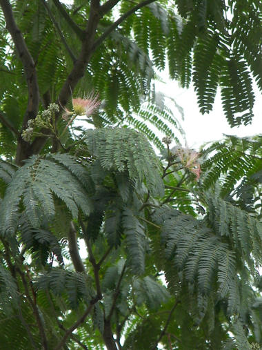 散歩道の工事中に迂回していた道の途中の、市役所出張所の庭にねむの木があった。3月末で工事が終わったので朝の散歩でわざわざそちらを歩くことはなくなったが、このねむの木が気になって時々何時ものルートを外れて「花はまだかな?」と見に行っていたら、昨日の朝やっと咲き始めたのを見つけた。大きな木で枝が高くて花も 5mくらいの高さのところで、よく見ないと分からないくらいしか咲いていない。x8で一杯にズームアップしても花の画像は小さいが、淡い肉色~ピンクのボサボサした筆の毛先のような花と見てとれる。ニセアカシア、特に春先に咲くギンヨウアカシア(別名ミモザ)に花も葉っぱも形が似ているからニセアカシアなどと同じ種類かと思ったら、科は予想通り同じだが科の名前はネムノキ科というらしい。この花も昔、小学校に通う道すがら土手に咲いていたのを見た記憶があるが、花よりも葉っぱを取って撫でたと思う。 | |