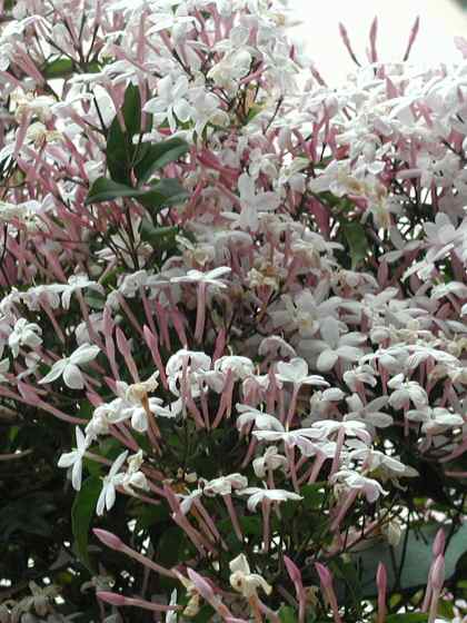 毎朝、会社への行き帰りに、強い花の香りがします。なんだろうと思って見回すと、頭の上1mほどのフェンスの上に ジャスミンの花がびっしりと咲いていました。 ジャスミンの香りも、どこからともなく漂ってくるくらいならいいのですが、こんなに強いと思わず「花粉症にならないか」と心配になって息を潜めて通り過ぎます。 こんなに強い香りにもかかわらず、このあたりはミツバチがいないのか、一匹も飛んでいるところを見かけません。もはや都会の花は、人間たちのためだけにあるのでしょうか。