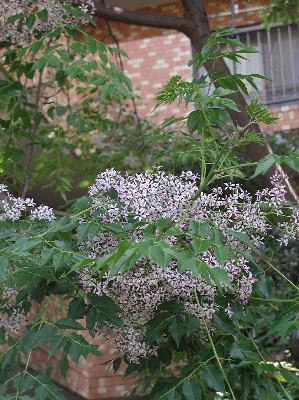 5月末頃 通勤で通るバスの停留所に、小さな薄紫色の花を沢山つけた木があるのに気付きました。花は数mmくらいの小ささですが沢山の花が緑の葉の間から見えています。花の大きさ、集まり具合、葉の感じ、どれもちょっと「気になる」木です。 「気になった」ので、Webで検索すると どうやら「栴檀は双葉より出でて双葉より芳し」の「栴檀」のようです。 しかし、実際には「栴檀」の木にはそれほど香りはないようで、この諺の「栴檀」は実は「白檀」だということも分かりました。 バスの停車時間中に、窓を開けてパチリと一枚、撮り終わって気付くとその先はマンションのベランダ・・・・! 怪しいオジサンをしてしまいました。