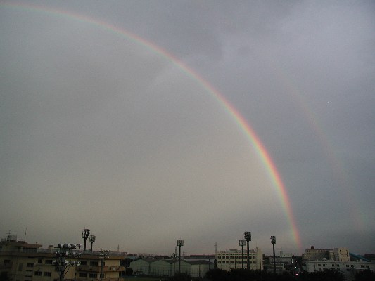 今日は入梅して、一日どんよりとした天気でしたが、夕刻 日没の頃ふと窓の外を見ると、きれいな虹が出ていました。 南の方角から立ち上がり、反対側は北東にまで ちょうど完全な半円形で南の方角は虹が光るほどに鮮明に出ています。よく見ると さらにその外側にもう一本薄いのですが虹がかかっています。これほど鮮明な180°の虹でしかも二重の虹はとても珍しい光景で思わずカメラを取り出してパチリ。 写真では外側の虹は薄くて見分けが難しいのですが一応何とか見えています。