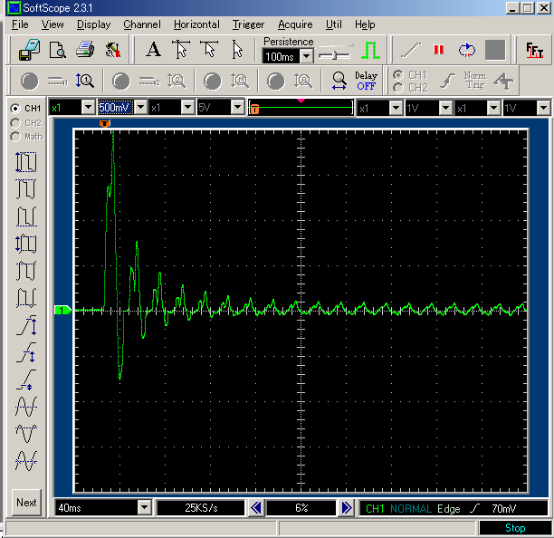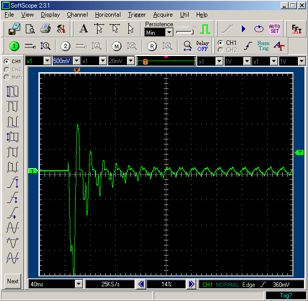 まず、負荷であるウーファーアンプに流れる電流を測定します。定常的にはデジタルテスターで計って、200mAくらいだと分かっていますが、電源投入時には当然、電源コンデンサなどへの突入電流が流れているはずです。これは波形で見るしかありません。こうしたときに活躍するのが例のデジタルオシロです。 ウーファーアンプと直列に2~3Ω程度の抵抗を入れて、その両端の電圧波形を観測します。