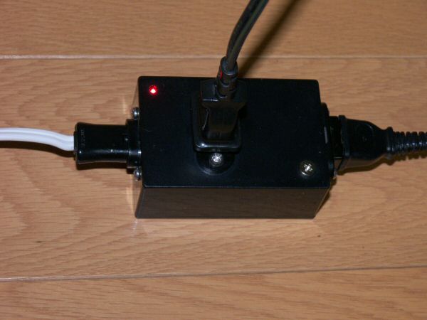 インジケータのLED(左上隅:赤色)の光がまぶしいです。 いよいよ、お待ちかね! コンポステレオとウーファーアンプのプラグを差し込んで、コンポの電源ON! ほぼ同時にウーファーアンプの電源が入りました。 これで CDを聴くと何となく今までよりもいい音のような気がしてきたりして・・・そんなことはないはずですが、気分の問題です。 今度は、リモコンで電源が切れてもタイマーで切れても、ウーファーアンプの電源も追従します。やっぱりこうでなくちゃ! |