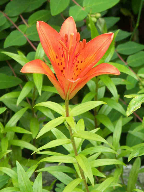 赤い「ユリ」だと思う。ユリは白から赤や黄色まで色々な色があるようだから、これも何とか名前があるんだろうけど、この花が咲く庭の住人も高齢化したのかもう何年も見ない。それにしては庭はある程度手入れされているようだから、遠くに住んでいる子供でも時々来て草取りしているんだろうか。