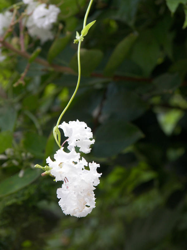 写真だけ。 名前も知らないが、つる性の白い小さな花。 ティッシュペーパーで作ったようなフワフワした感じの小さな花がつるの先に集合している。空き家になったと思しき家の植木の枝につるが絡みついていた。ちょっと気になったので撮影してきたが、葉っぱはよく見てこなかったので名前を探せない。 (後日記:とあるページで指摘されたが、どうやら 別のヘクソカズラのつるに白いサルスベリの花房が落ちてきて引っかかっていただけらしい。そう言われてもう一度よく見ると画面の奥に白いサルスベリの花らしいものが写っている。Webでさんざん「ツル性植物」の花を検索したがこんな形の花は見つけられなかった) |