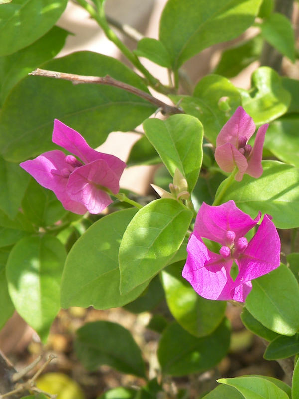 散歩道を少し外れた商店街のシャッターの前に珍しい花が咲いていた。ブーゲンビリア、南国の花と思っていたがこの辺りでも冬の寒さを工夫すれば夏は露天で咲くらしい。この3枚の花びらのように見える部分は実は包葉という花を囲む葉っぱらしい。そう言われてよく見ると葉脈のようなものが見える。花は中心に3本見える柱のような部分で、先っぽが小さく開いて白っぽく咲くらしいがこの写真ではまだ咲いていない様子。これも花を目立たせて受粉のために虫などを呼び寄せるための知恵なんだろうか? |