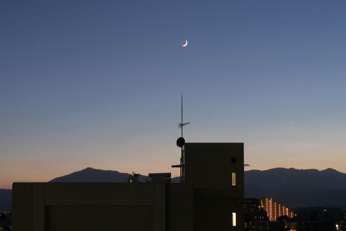 今日の写真は2日ほど前の残照に浮かぶ三日月?二日月? 暑くても季節は確実に秋に向かっている。写真をクリックして拡大すると山の端に宵の明星(金星?)も見える。