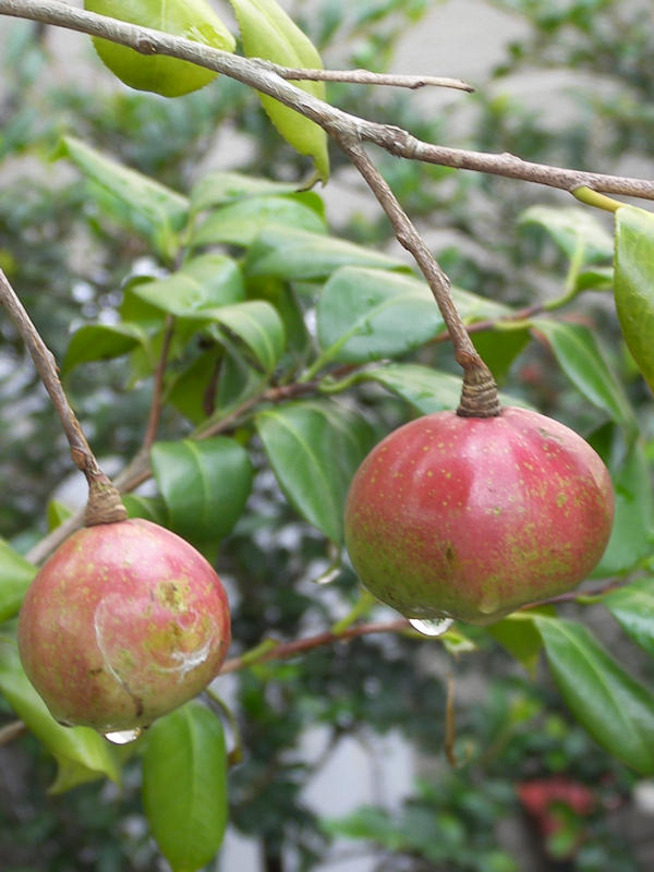 台湾をスーパー台風が襲っているという。風速 85mという想像を絶する風も荒れ狂っているらしく、3tもある大型コンテナが段ボール箱のように突風で崩れたり走っているバイクが風で押し戻される映像がニュースで流れている。専門家の話では温暖化の影響で海水温が高くなると台風の勢力も強くなるとかで、日本にもいずれ同じような化物台風が襲来するとか。 今年は今のところ比較的平穏な気がするが、このまま過ぎてくれることを祈るばかり。 雨であまり撮影するチャンスがないが、雨なら雨でそれらしい風景もあるだろうと、傘をさして散歩にでかけたら色づき始めた椿の実に雨露が下がっていた。いかにも椿油のありそうな艶やかな実だ。 |