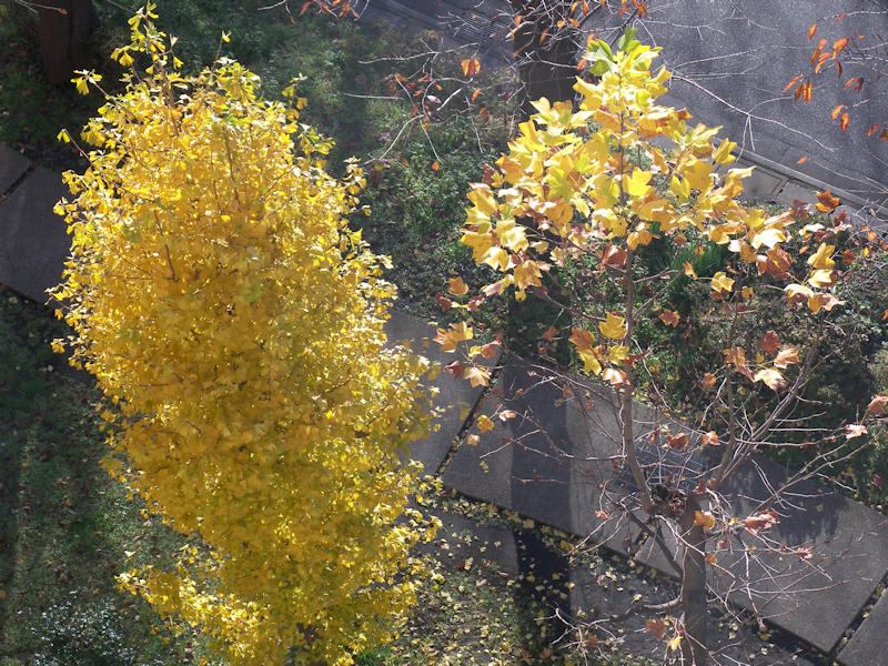家事分担の洗濯物干しをしながら、ふと下を見下ろすともう見頃を過ぎたと思っていた紅葉がここだけは真っ盛りの体。道路側の桜の木はもうすっかり紅葉から落葉に変わってしまっているが、イチョウとスズカケが黄色く紅葉していた。