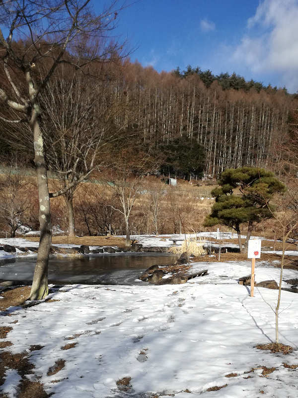 再び岡谷に来ているので話題を変えて。 このところの寒さで諏訪湖には数年ぶりに御神渡りが出来て八剱神社の神主が氷上で神事を行ったらしいが、毎日スマホの待ち受け画面に表示される最低/最高気温を見ていて気づいた。ここ岡谷市の最低気温は凄まじい。3日ほど前のスマホの画面では -13℃が記録されたようだが、近隣の諏訪市やもっと北にある松本市の最低気温は -9℃弱だったようだ。ほんのわずかしか離れていない場所でも 4~5℃の差がある。 その昔、青森の内陸部から来た人が「青森よりもずっと寒い」と言っていたくらいな寒さ。そんな寒さの中、毎朝(と言っても陽が昇ってから)近くの出早神社周辺まで散歩しているが、社の池の表面が半分ほど黒々として池の底が見えていた。一瞬「氷が割れたのか?」と思ったがそんなはずはない。試しに雪の塊を拾って投げると表面を滑っていった。油氷になっていたのだった。 そんな寒さだから冬になってから耳は耳当てをしているが、覆えない頬は暫く歩いていると凍ってしまいそうに痛くなって、しもやけ防止でマッサージしながら歩いている。子供の頃に味わった懐かしい感触だ。 散歩から帰って 10時頃に洗濯物を干すと干した端からタオルなどは凍っていく。それでもお日様の力は有り難く、陽が傾くころには洗濯物は乾いているが。 今日の写真は、そんな厳寒の「神の池」の風景。 |