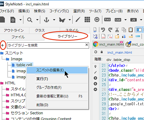 最近ホームページの作成・編集などに使っている「StyleNote5」と言うHTMLエディタだが、毎日ゴリゴリ HTML/cssを書いているわけではないのでつい使い方を忘れてしまう。ここ数日探していた機能の使い方が分かったので備忘録的にメモ。 よく使うダグの複数のセットをクラスや属性含めて登録し、簡単に呼び出すには ① IME日本語辞書に単語として登録し「読み」で呼び出す。② 専用ツールによるクリップボード拡張などによる方法。などもあり、私の場合多くは ①の方法を使ってきたが、最近 画像のキャプション機能や、縮小画像上にマウスカーソルを乗せることで原寸画像が表示されるような機能を使うようになったこともあり読みやすさの点から途中で「改行」を入れたいと思うようになった。しかし ①の方法では改行が入らないし文字数が296文字までしか登録できない。②の方法なら改行が入るし、すでに常駐させている Arttips等というツールでも定型文の挿入機能は使えるが、「StyleNote5」上で使おうとするとホットキーがバッティングしたりして使いづらい。アレコレ思案していて「そう言えば StyleNoteでも定型文挿入機能があったような?と思って探したが、メニュー上からはそれらしい表現は見つけられなかった。 今回 腰を落ち着けて Web検索、公式ページなどをうろついてやっとそれが「スニペット」と呼ばれている機能だと言うことにたどり着いた。 使い方の概要は次の通り。 ![]() ![]() 左ペインの「ライブラリー」タブを開いて「スニペット」を選択。その上で右クリックして「グループの作成」を選択し名前をつけてグループを登録。そのグループを選択した状態で左上の「+」マークをクリック。新しいスニペットの 登録画面 が表示されるので名称とその下に定型文を入力して「保存」を押すと新規にスニペットが登録される。一旦登録したスニペットの内容はその上で右クリックすれば変更画面が表示されて修正できるが「名称」の修正はできないようなので、一旦削除してから登録し直すしかなさそう。 今日の写真は若干遅咲きの駿河台匂と言う桜。名前の通り近くを通っただけで強い匂いがする。ハナバチなどが盛んに蜜を吸いに集まっている。 |