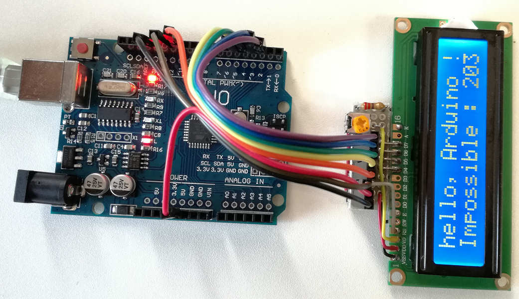 で LCD表示モジュールへの出力のサンプルコードを試してみた。ハードウェアをハンダ付けするのに2時間、コードはほとんどコピペで写真のような表示ができるようになった。さすが Arduino !!!