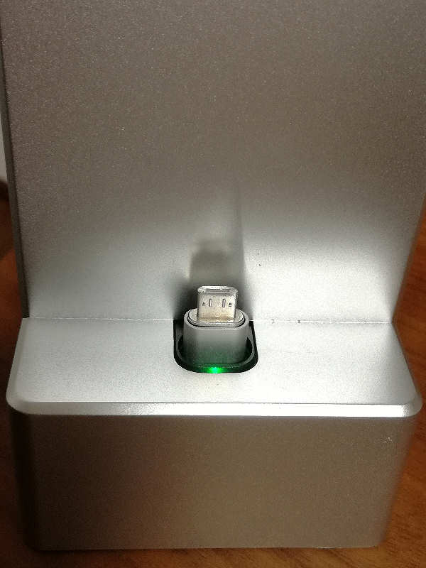 充電スタンドの使い心地は?というと、若干スマホをスタンドに乗せるときに位置を気にする必要があるが(ベッドに寝てしばらくスマホをいじって、さて寝ようか! となってから寝たままで枕元のテーブルに手を伸ばして、半ば手探りのようにしてスタンドに乗せるので端子位置は見えていない)カチンと吸着してくれるので使い勝手は悪くない。