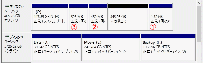 30分ほどかけて復元して見たが、結果は同じ。ただ、復元直後に Windows10 Version1903のアップデートが始まった。これを 1時間ほど我慢して待って、再びディスクの管理で Disk0 を見ると、回復パーティションが一つ増えている。元々 450MB程度の回復パーティションがあったその前(C:ドライブの直後)に 525MBの新しい回復パーティションが出来ていた(右図は①が数日前まで使っていたときの回復パーティションの痕跡、②が2年前のイメージを復元した際の回復パーティション、③が今回 1903のバーションアップで出来た回復パーティション)。で、もう一度回復ドライブの作成を行ってみたところエラーは出なくなった。早速①と②の古い回復パーティションは削除してからイメージバックアップを取り、回復ドライブの作成を実行。