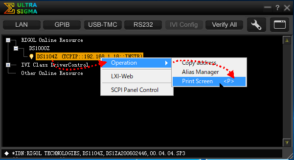 「Create LAN Instrument Resorce」ウインドウが消えて元のアプリウインドウに戻るが、「RIGOL Online Resources」の下にシリーズ名が表示されて、そこに該当のデジタルオシロの機種名とIPアドレスが表示される。この状態で デジタルオシロの側で波形を記録し、該当機種の IPアドレスの上で右クリックしてコンテキストメニューを表示させて「Operation」>「Print Screen」と辿ってクリックする。