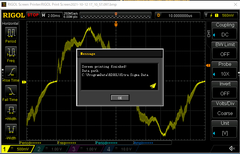 するとデジタルオシロの画面がそのままダウンロードされて、別ウインドウに表示されて、そのファイルが通常 C:\ProgramData\RIGOL\Ultra Sigma Data フォルダーの中に 「RIGOL Print Screen2021-10-11.xxx.png」のようなファイル名で保存される。あるいは「Message」ウインドウを「OK」ボタンを押して消してから、ウインドウ画面上で右クリックして「Copy to Clipboard」を選択すれば画像がクリップボードにコピーされるので、Wordや画像処理ソフトなどの「貼付け」メニューを使って直接画像として貼り付けることも出来る。実験メモやレポートなどを Wordで作成しつつそこに測定波形を貼り付けるには手間が省けて非常に便利だ。 | |