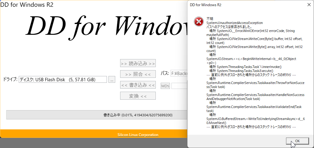 一方 DD for Windowsの方は Linuxの DDコマンドを Windows上で実行できるようにしたもので、最新バージョン R2を Windows11上で実行したところ、バックアップは問題なく出来たが、復元しようとするとエラーが出て使えなかった。仕方なく 古いバージョン(0.9.9.8)をダウンロードして試すと(Xp互換モードを設定する必要があるが) R2で保存したバックアップデータのままでも復元できた。(と思ったら何故か2度めは装着した USBメモリが表示されなかった)こちらはバックアップデータの圧縮は出来ないと思われる。 >>DDコマンドでバックアップに続く