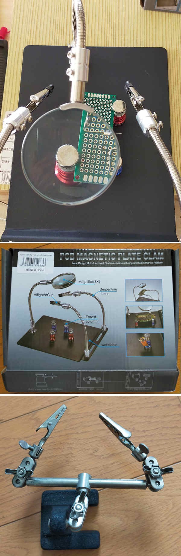 今週は岡谷に来ているが、関係ない話題で。 1週間ほど前に 久しぶりに町田まで出かけた。目的は別にあったが町田に出たときにはルーティーンのようになっているドスパラに寄ってみた。とりあえずパソコン関連グッズには触手が伸びないが、店頭に並べられた上海問屋の便利グッズに目が止まった。 上2つの写真の自在ワニ口とルーペがセットになった作業台。ハンダ付けの時などに部品とリード線の固定が手が2本では足りず、部品を万力でリード線をクリップで固定する時に便利で、実はかなり昔に千石電気で購入したことがあった(一番下の写真)。しかしこのすでに購入したものはワニ口の可動や固定が蝶ネジになっており、クリップの向きや傾きを変えるには2個の蝶ネジを緩めて固定する必要があるが、同時に2箇所を回すことは出来ないので実際にはかなり使いづらかった。対してこの新しいグッズはワニ口が蛇腹のフレキシブルチューブになっていて、しかもテーブルへの固定がマグネット吸着なので、自由度がかなり高そう。加えて(外箱の写真だけで判断すると)付属の4個のカラフルなマグネットのピンのような部品でキバンの固定も考えられているらしい。このピンは少なくともキバンへ部品を位置決めしてハンダ固定するには便利そう(最近、悲しいかなピンセットでは手が震えて固定もままならない ;;涙;;)。この時点で急速に「欲しい」虫が蠢き出した。しかしすでに似た道具はあるし、ネットならもっと安く入手できるかも?と考えて、そこはぐっと我慢して一旦帰宅。 家で Amazonなどで同様のグッズを検索すると同じものがヒットしたが 4,200円程度することが分かった。ドスパラの店頭価格は処分価格の 2,700円程度だったので、「これは買いだ!」と判断。数日後に再び出かけてゲットしてきた(最初に見た時、箱は2個だけだったので既に売れてしまったのでは、という心配は杞憂でまだ2個とも並んでいた)。 しかしこんな道具を買っても、老眼も進行しているので最近ハンダ付け作業はさっぱりご無沙汰している。いつ使うんだろう? | |
