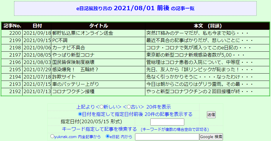 しかし一旦作って見ると、来訪者には関係ない話とは思うが自分で使う上ではいくつか不足している機能があると気づいた。例えば、e日記と銘打っている以上、自分の中の位置づけはあくまで「日記」であって、ほんのタマには「1年前(10年前)の今頃は何していたっけ?」と思うことがあるが、そんな時 今までは当てズッポで適当に番号を入力して探してみるしかなかった。しかしそんな場合も 機能としては「◯◯年◯月」とか入力して、その前後のリストが表示されれば便利だろうと考えて、当該のスクリプトを改造してみた。