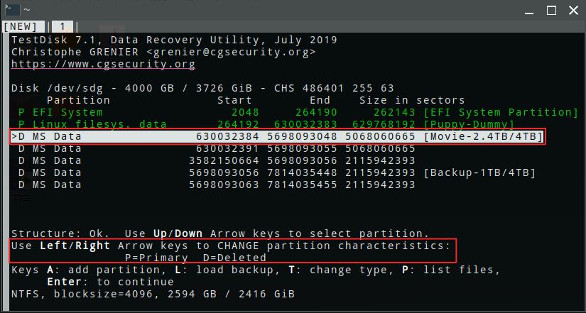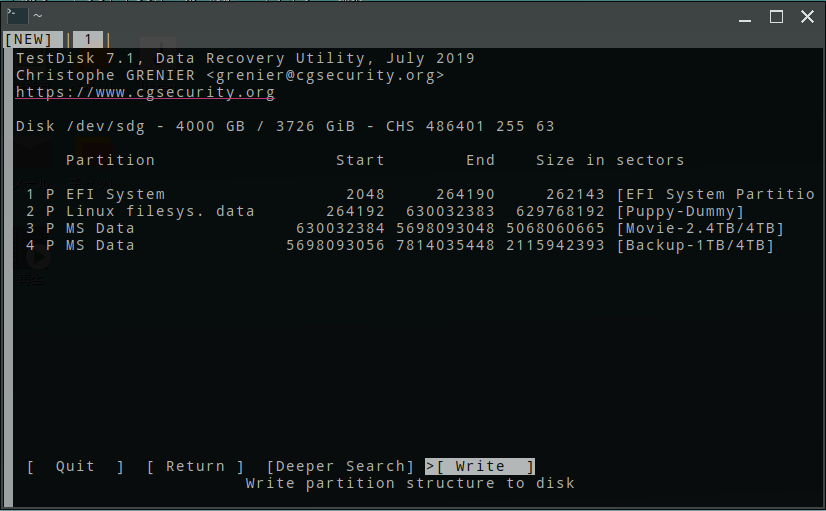 次の画面で変更後のパーティション状態が表示されるので、それを確認して「Write」を選択すると、修正したパーティション情報が書き込まれる。 こうすることで、結局 4TBのディスクの 4個のパーティションが 30分かからないで復元できた。 | |
