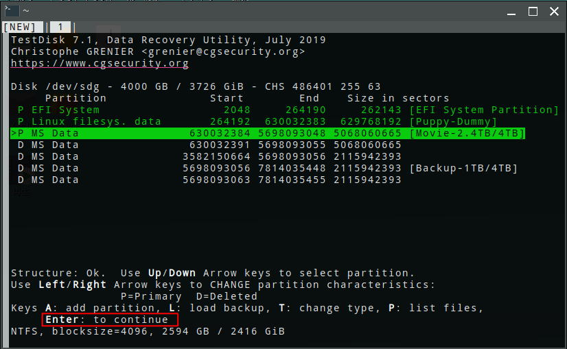 またまた狭い話だが、Web検索しても表面的な記事が多くここまでの方法はなかなかヒットしなかったので自分用 Memoとして残しておく。 最近 Puppyなどの Linuxをインストールして遊んでいるが、HDDのバックアップイメージを復元するのにターミナルコマンドで操作するので、タイプミスなどでHDDなどのストレージのパーティションが壊れることが間々ある。それをリカバリー(復元)したいときに色々な復元アプリがあるが、パーティションのリサイズや削除・新規作成を繰返している HDDでは GUIのアプリでもなかなか素直には復元できないことが多い。 そんな時に強力な復元力を発揮してくれるのが TestDisk というフリーのCUIアプリだ。 Linuxの各種 O/Sをかまっている時にパーティションをすっ飛ばしてしまって、今までも何度かお世話になっていたが、いつも「Deeper Search」という機能を使って復元していた。これだとかなり強力な復元が可能だが、半面 HDDの全領域をスキャンしてパーティションの境界と思われる痕跡を徹底的に探して、論理的に矛盾なく復元できるパーティション候補を全てリストアップしてくれるのでありがたいが、過去に削除したりリサイズした時の痕跡も残っている限り探し出してくれて、その分時間がかかる。USB3.0外付けで接続した場合でも 5時間/1TB程度を覚悟しなくてはならない。それ以外の方法は?と思っても、Webにはあまり情報が無かった。