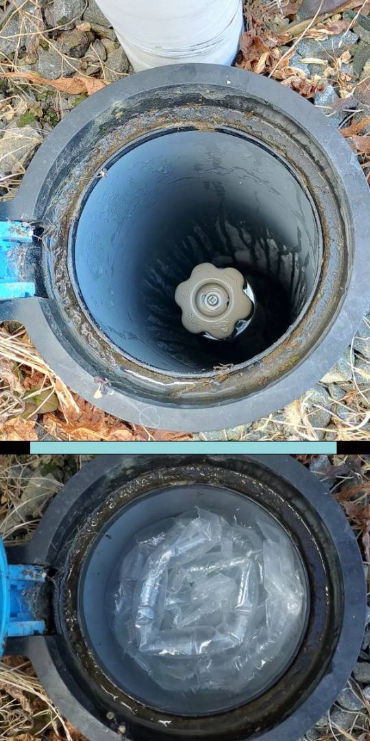 ・・・・と言う事で、試しに不凍栓のカバーを開けて止水栓を回そうとしたら左右どちらにも回らない(写真上)。試しに水道側の止水栓を回してみたら半時計方向には回る。 どうやら地中 1m位のところにある水道管は凍らなくても、止水栓の穴は空気なので -10℃の外気に冷やされた寒気が降りていって<不凍>栓が<凍ってしまった>ようだ。そこでヘアードライヤーを持ち出して熱風を3〜4分送り込んでみた。熱気は軽くてすぐ上昇してしまうから水道管の所まで温まるかどうか半信半疑だったが、ちょっと待ったらバルブは回るようになった。そうしておいて暫く様子を見ていたら、目一杯お湯の側にして開けておいたキッチンの蛇口から水が出始めて、間もなくお湯が勢い良く出るようになった。どうやら凍結箇所はここで間違いない。