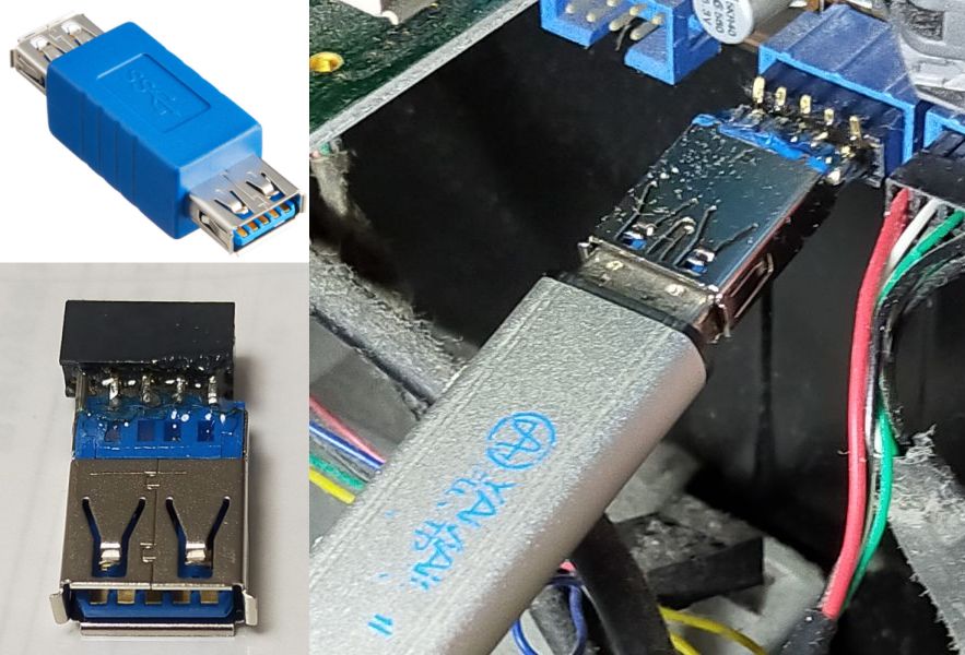 特に欲しい物があったわけではないが、普段工作しようとすると足りない部品にぶつかることもあるので部品棚を見ていたら USB-Aコネクタ(メス)同士のアダプタが目に止まった(写真左上)。「メス同士なんて何に使うんだろう?」と疑問に思ったが、ちょうどマザボの USB端子に USBメモリを直付けしたいと思っていたし、値段を見ると 100円で「何かの間違い?」と思ったが即購入。ここからメスコネクタが2個取り出せれば、50円/1個だから部品を買うより安いハズ。(家に帰って ネットで検索すると Amazonでも 560円となっていた。売れずに見切り品だったんだろうか?) コネクタは USB3.0対応だが、下位互換なので USB2.0側の端子だけ使えばいい。