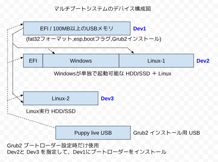 そこでこの USBメモリ(右図の Dev1)に Linuxのブートローダーの Grub2をインストールして、PuppyとWindowsと Ubuntuを登録。PCのブート設定でこの USBメモリの起動優先順位を頭にもってくれば、Linuxと Windowsがデュアル(トリプル)ブートするようになった。