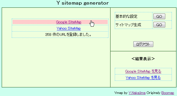 Google SiteMap と Yahoo SiteMap のリンクが現れて、URLの登録件数が表示される。