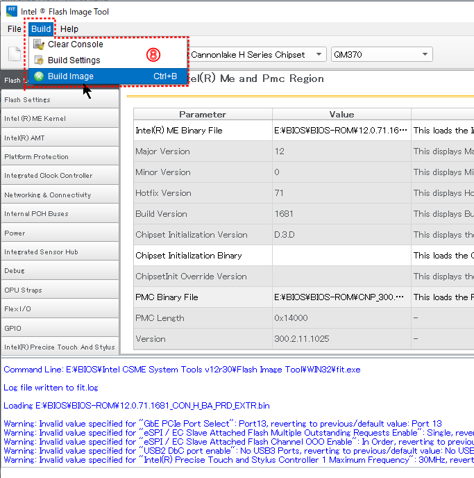 ⑧ 設定が完了したら CSMEイメージをビルドするために左上の「Build」メニューから「Build image」を選択する。