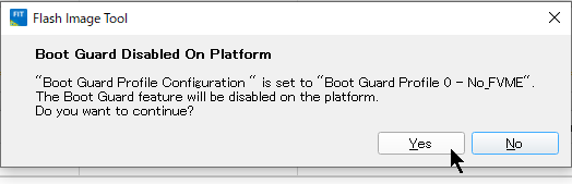 ⑨「Boot Guard Disabled On Platform」 というダイアログがポップアップするので 「Yes」をクリックする。