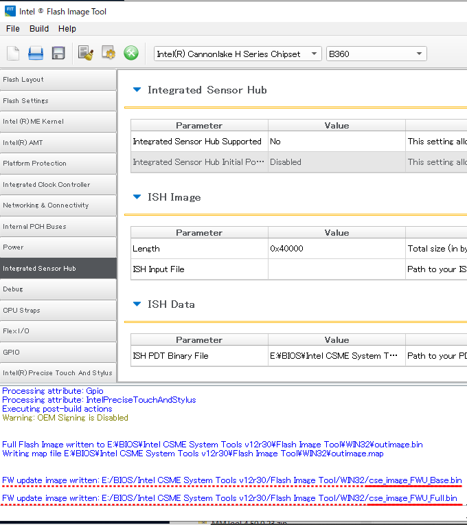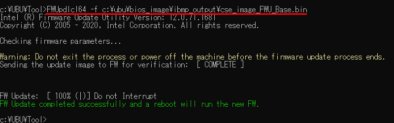 以上でやっと PMCファームウェアを含む CSME イメージが作成されたので、(他のPC上で作業していた場合)ここからターゲットの PCを起動し、Windows上から FWUpdateツールを使用して、「cse_image_FWU_Base.bin」イメージをフラッシュする。