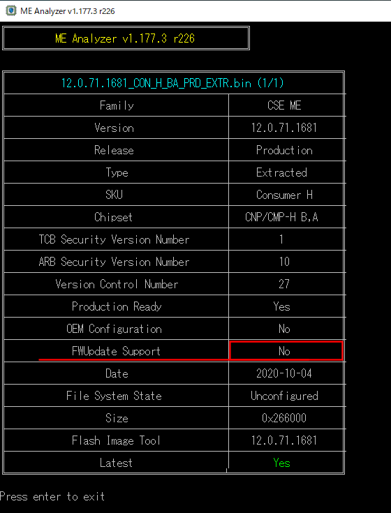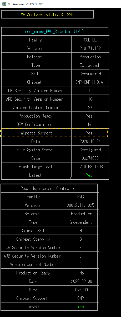 上記で解凍した CSMEファームウェアファイル (12.0.71.1681_CON_H_BA_PRD_EXTR.bin) をMEAnalyzerツール(MEA.exe)にロードして、「FWUpdateSupport」が「Impossible」として報告されていないことを確認する。