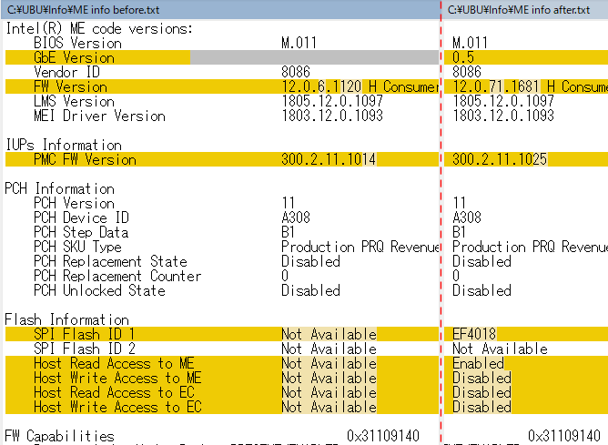 アップデート前後の ME Info を比較したのがこの図で 地色が黄色の項目がアップデート後に変わっているが、ME versionが 12.0.6.1120 > 12.0.71.1681 に PMC FW Version が 300.2.11.1014 > 300.2.11.1025 にアップデートされたのが分かる。