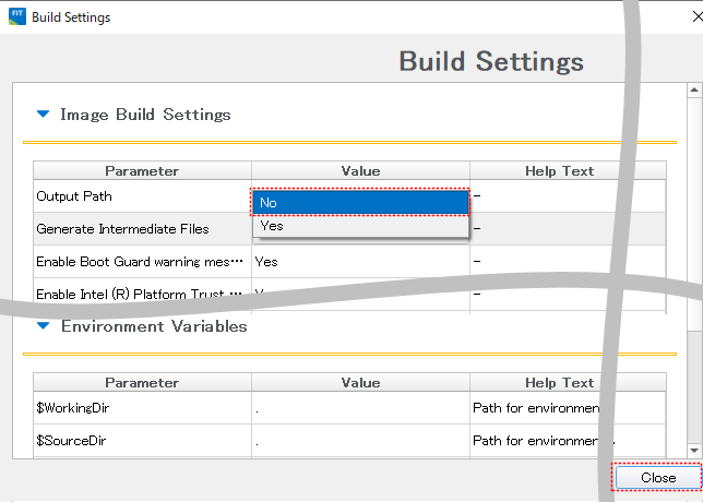 B. 「Build Settings」というウインドウがポップアップするので、その中の「image Build Settings」中の「Generate Intermediate Files」で「No」を選択し、他のすべての設定はそのままにして、「Close」をクリックして「Build Settings 」ウインドウを閉じる。