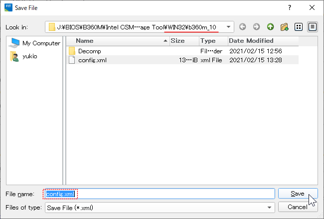 C. 親ウインドウに戻るので "File > Save As" に移動し、構成済 xmlファイル(この場合は「config.xml」という名前をつけて)を FITツールの実行フォルダー配下のBIOSファイル名(図の場合は \b360m_10 )のついたサブフォルダーに「Save」をクリックして保存し FITツールを一旦閉じる。