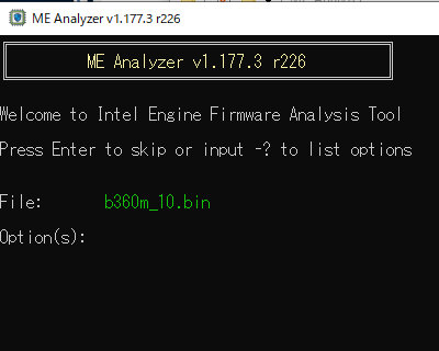 この BIOSを ME Analyzer(MEA.exe)に D&Dすると図-1のような コマンド画面になるので Option(s): は空のままでEnterキーを押す。