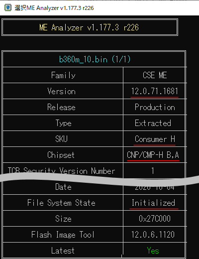 この他同じフォルダーに「cse_image_FWU_Base.bin」「cse_image_FWU_Full.bin」という2つのファイルも出力されている。(多分 UEFIがファームウェアアップデート機能を有していればそこからこのファイルを使って CSME領域だけのアップデートもできるのだと思うが、B360Mにはそうした機能はないのでこちらのファイルは使わなかった。)