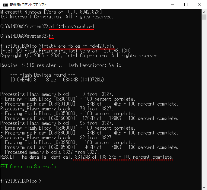 同じ FPTW64に -I パラメータをつけて実行したのが 図-9で、この図から書き換えられたのは赤下線の BIOS領域( 300000 ー FFFFFF の 13312KB)だとわかる。